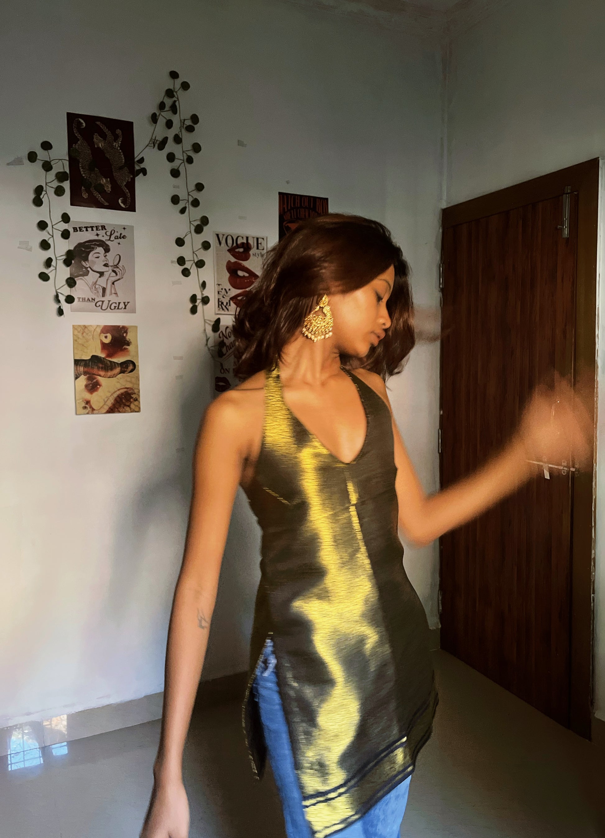 BROCADE HALTER NECK BACKLESS SHORT KURTI